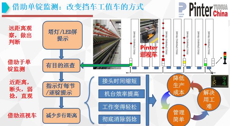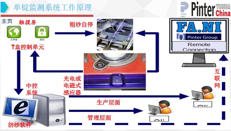 采用电磁感应原理,电磁感应器独立自由的安装在固定轨道上,当需要维护时,可单独拆卸电磁感应器,非常方便,维护成本低。不受飞花、光线等影响,使用寿命长,性能稳定,感应距离范围广,不受纲领型号的影响,生头方便,无干涉。一方面在生产过程中减少用工;另一方面,生产的全过程实时监控:它能够在问题发生的第一刻提醒,将损失减到最低,改变挡车工值车方式,减少无效劳动,并可进一步明确分工,简化了工人的劳动,提高工作效率。坏锭自动显示和报警,可有针对性的对坏锭进行检查和维修,提高效率。